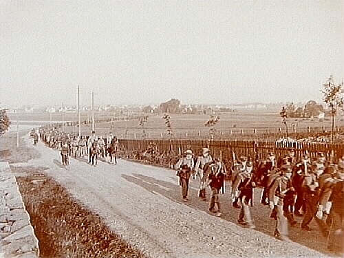 9 komp. Marscherande soldater på Almbyvägen, Almby socken.