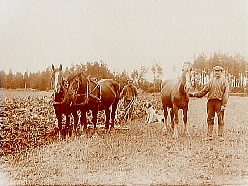 Vårbruk, två hästar spända för plog, en man med häst och hund.