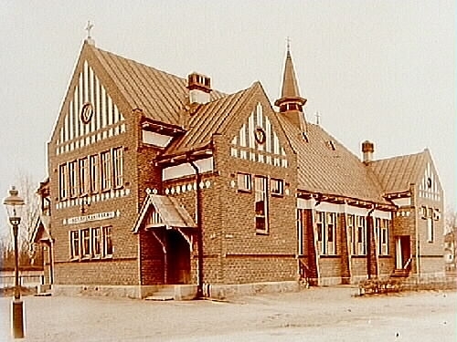 Betlehemskyrkan, frikyrkobyggnad med fasad i rött tegel med vita blinderingar.