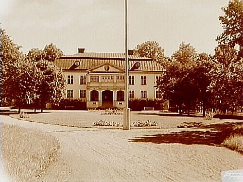 Sandbro Herrgård, tvåvånings herrgårdsbyggnad med frontespis, balkong och brutet valmat tak.