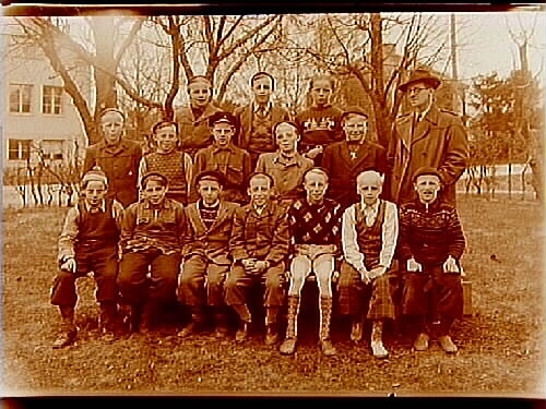Almby Östra skola, 15 pojkar med lärare herr Vikholm på skolgården.