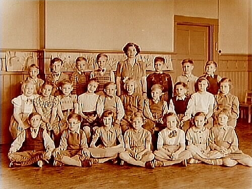 Almby Södra skola, klassrumsinteriör, 24 skolbarn med lärarinna fru Ingeborg Tedner, klass 2ak, sal 4.