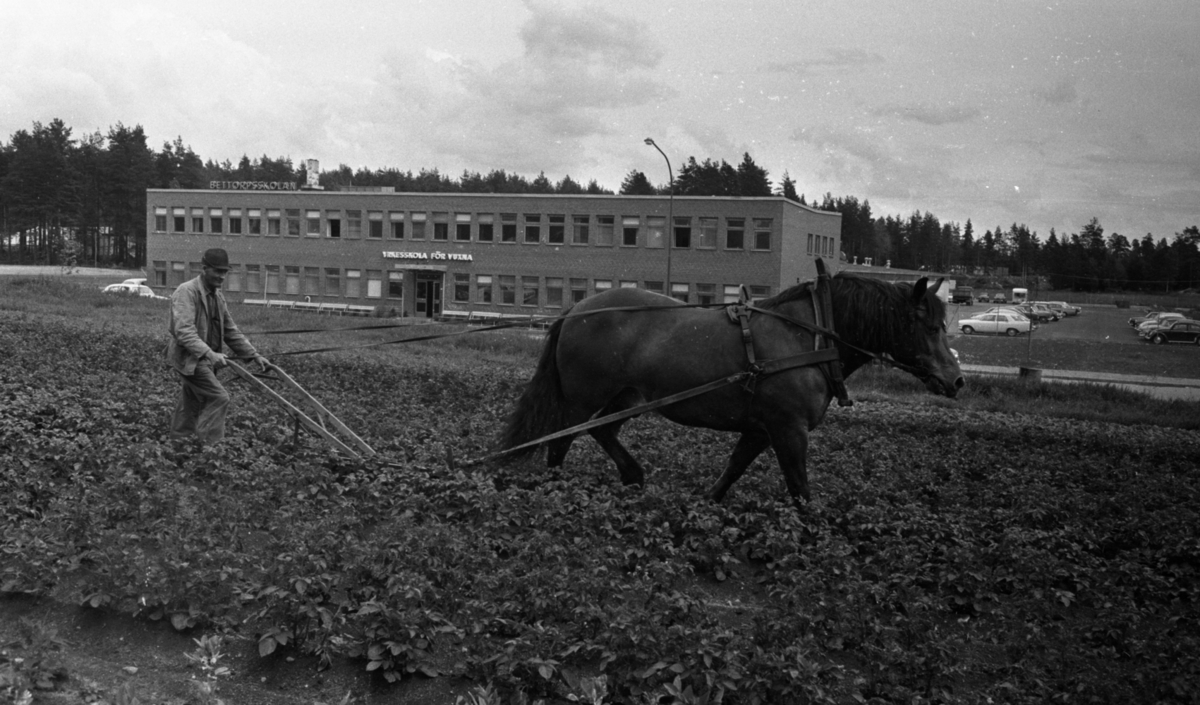 En man plöjer en åker med hjälp av en plog som dras av en häst. I bakgrunden syns Bettorpsskolan. Över entrén sitter en skylt med texten "Yrkesskola för vuxna." Till höger i bakgrunden syns bilar som står på en parkering.