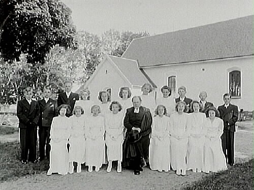 Konfirmander, 13 flickor, 6 pojkar och kyrkoherde Strömberg.