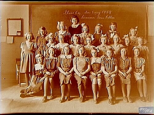 Vasaskolan, klassrumsinteriör, 23 flickor med lärarinna fröken Karin Sahlin, klass 6, sal 22.