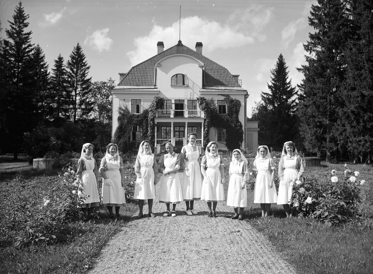Holmsätershemmet, tvåvånings villa i bakgrunden, nio barnsköterskor framför villan.