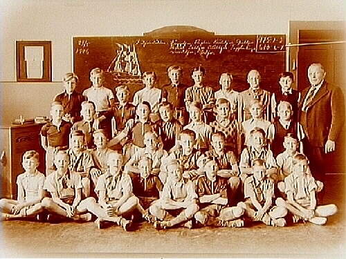 Olaus Petriskolan, klassrumsinteriör, 32 pojkar och lärare Ivar Zackrisson, sal 9, klass 4.