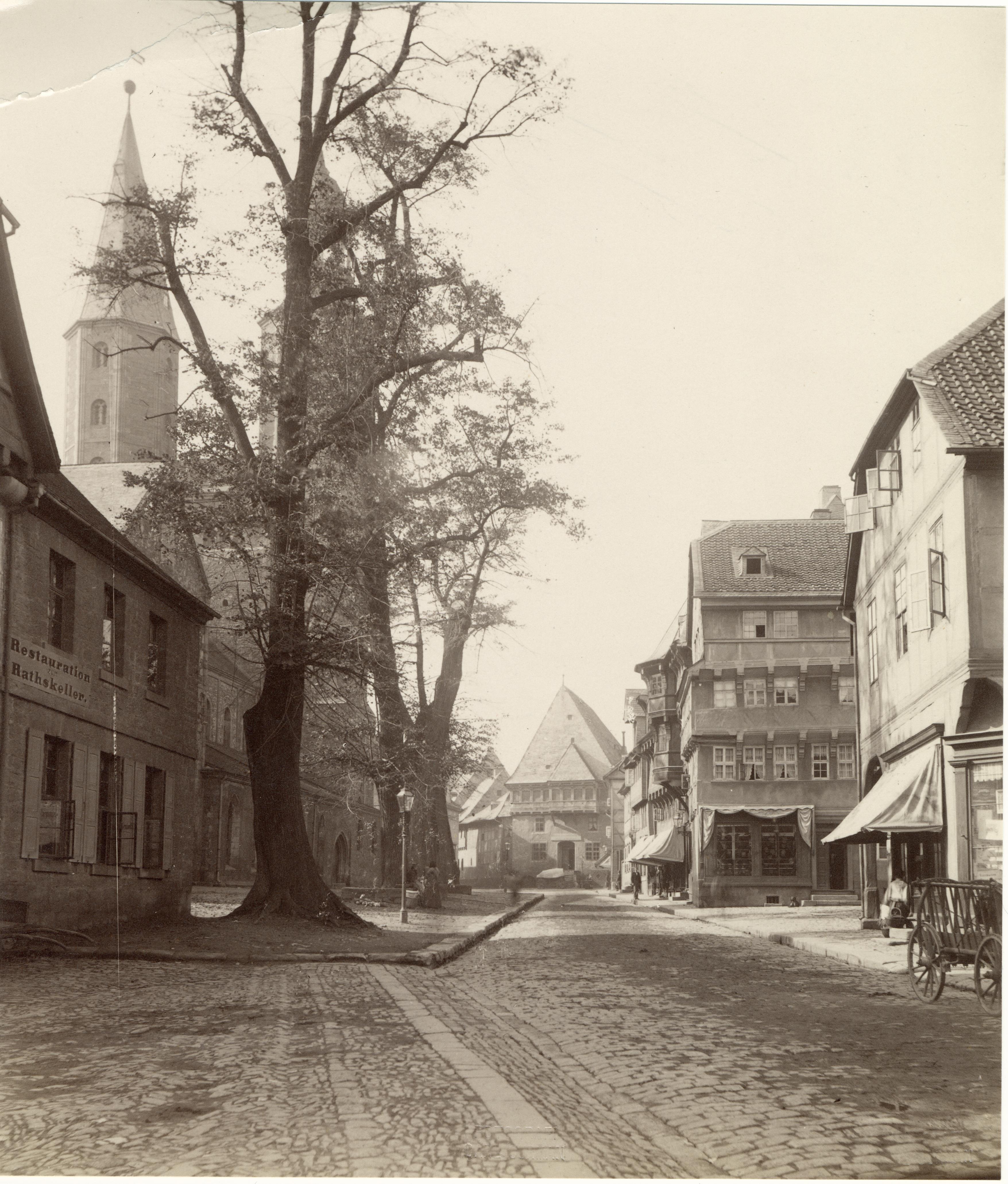 Bakom trädet syns tornen till kyrkan Marktkirche.