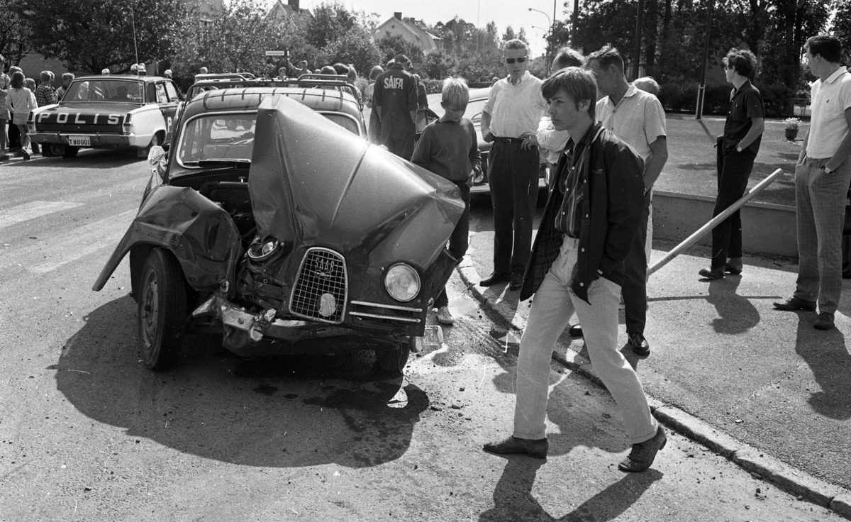 I förgrunden syns en ung man klädd i svart skinnjacka, randig skjorta, vita byxor och ljua knytskor går över gatan. Precis bakom honom står en bil som varit med i en krock och fått en skadad motorhuv. En polisbil syns i bakgrunden. Massor med folk står runtomkring på trottoarerna och tittar på. En ung man i overall står längre bort med ryggen mot kameran.