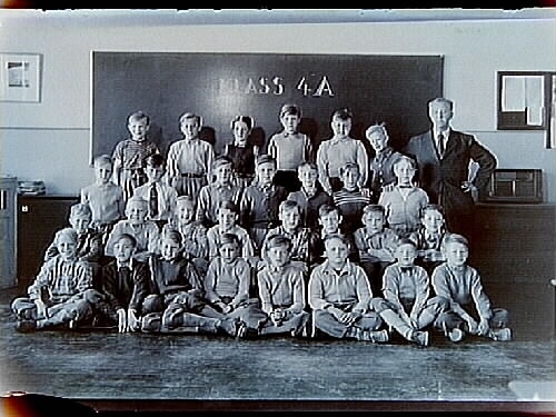 Olaus Petriskolan, klassrumsinteriör, 29 pojkar med lärare Gottfrid Reiland, klass 4A, sal 29.