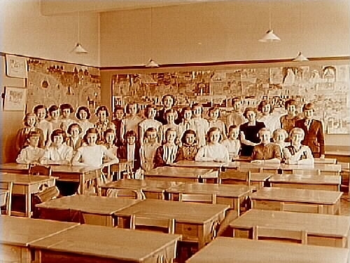 Engelbrektsskolan, klassrumsinteriör, 32 flickor med lärarinna fröken Dagny Borstedt, klass 6H, sal 24.