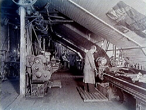 Interiör av Mekaniska verkstaden, två män vid svarvarna.