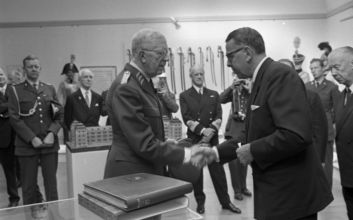 Kung Gustav VI Adolf besöker Örebro läns museum tillsammans med militärer. Kungen är liksom de andra männen klädd i militäruniform. I mitten av lokalen finns en stor miniatyrmodell av Örebro slott. Glasmontrar står i lokalen och sablar samt tavlor hänger på väggen. Kungen skakar hand med en kostymklädd man.