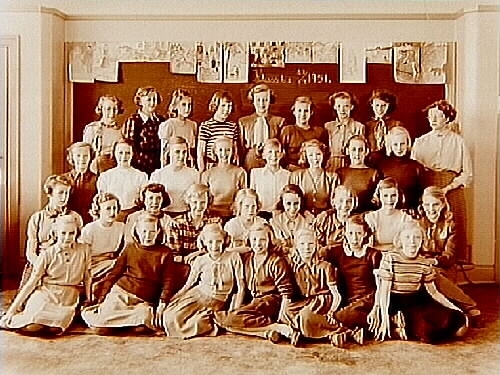 Engelbrektsskolan, klassrumsinteriör, 32 flickor med lärarinna fru Greta Tener, klass 6e, sal 13.