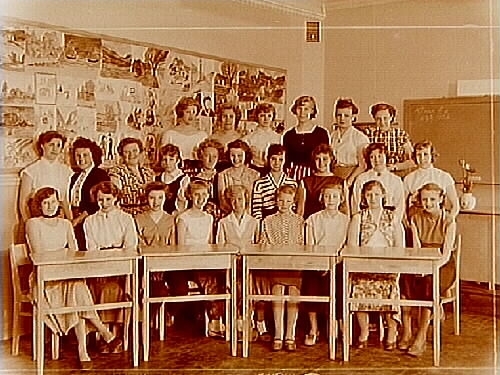 Nikolaiskolan, klassrumsinteriör, 25 flickor med lärarinna fru Helfrid Andersson, klass 8e, sal 2.