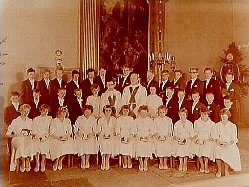 Konfirmander, 13 flickor, 22 pojkar, prosten Gabriel Carlsten och pastor Ekrelius.