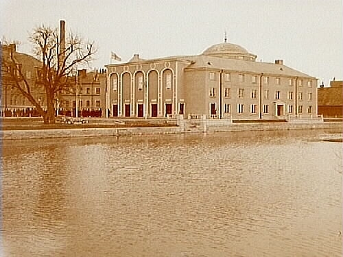 Konserthuset, stenhus i tre våningar med klassicerande fasad i grov puts.