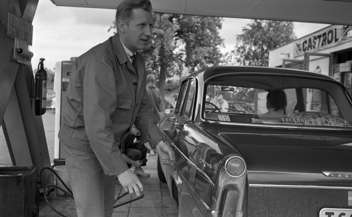 Fotbollspelaren Arne Selmosson vid bil på besinstationen. Kvinna i passagerarsätet.