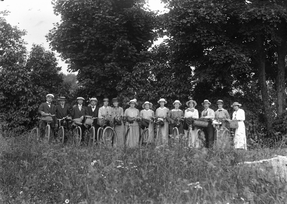 Gruppbild, 14 personer med cyklar.