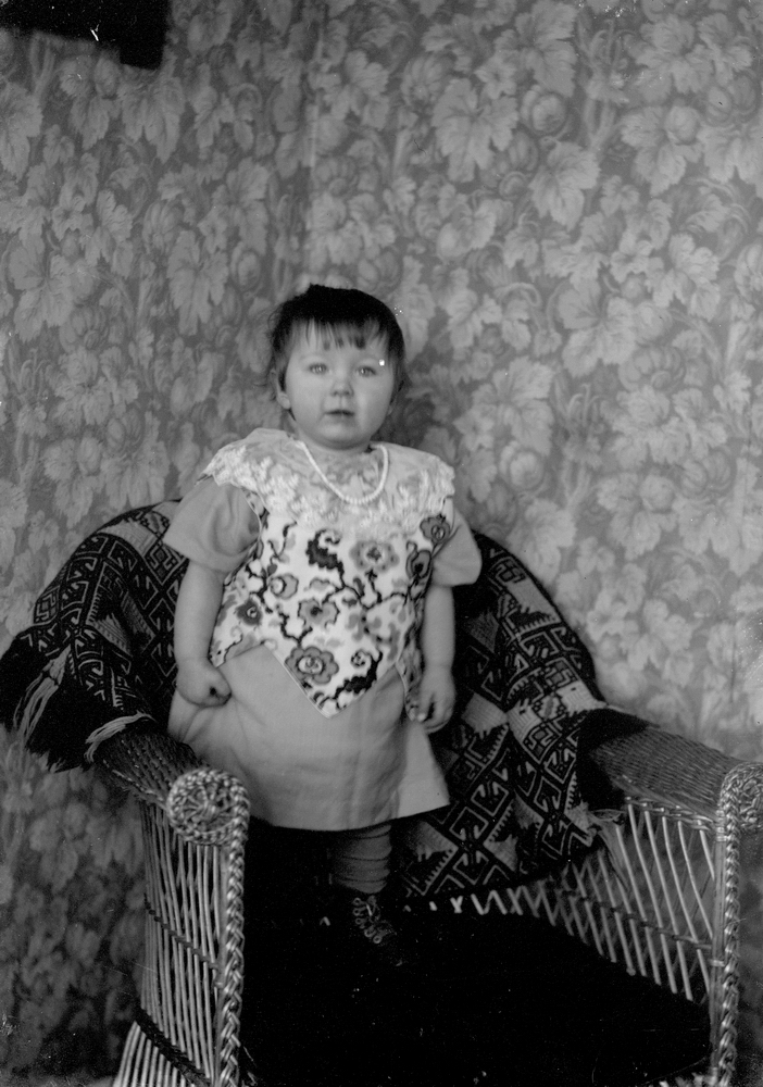 En liten flicka på ett stol.