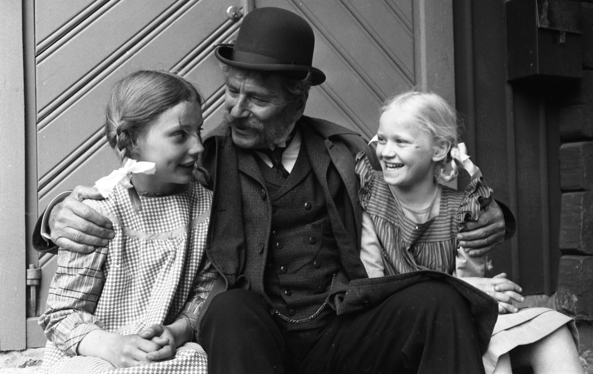 Titel: Wadköping 1 TV-inspelning 31 maj 1968 Den kände skådespelaren Edvin Adolphson med två flickor i tioårsåldern som också är med i filminspelningen av Markurells i Wadköping av Hjalmar Bergman. De är klädda i 1800-talskläder.