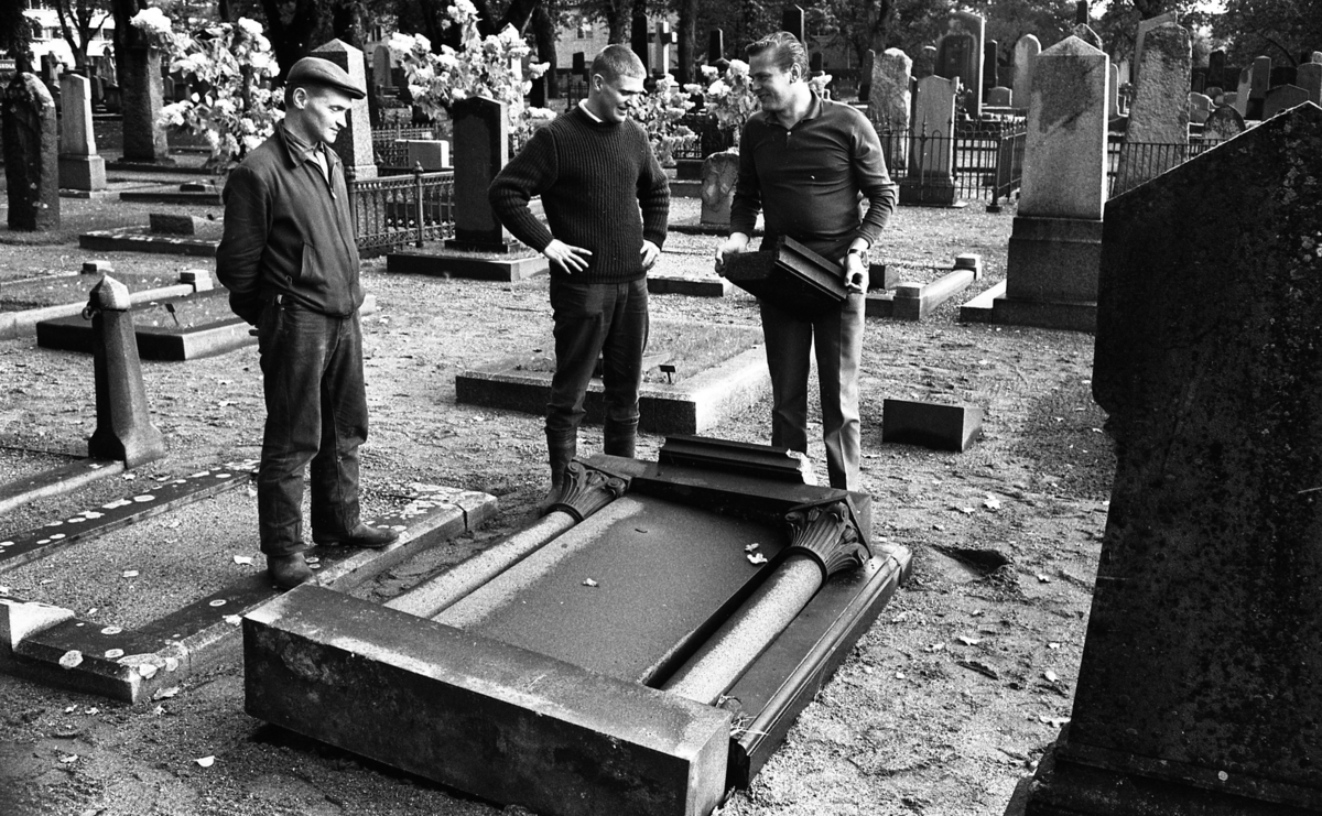 På Södra Kyrkogården står tre män vid en gravsten som vräkts omkull.