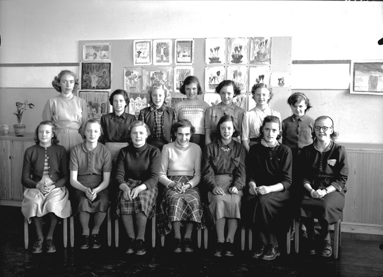 Olaus Petriskolan, klassrumsinteriör, 14 flickor med lärarinna fröken Vera Holmberg.