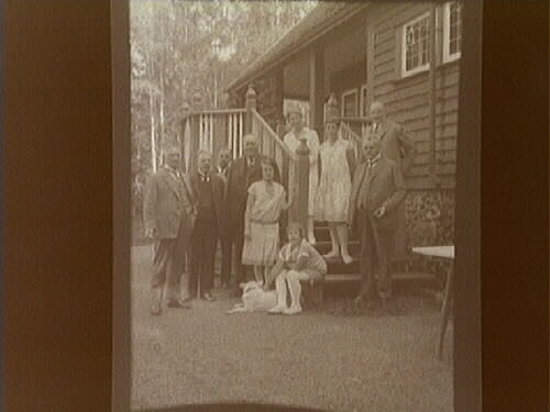 27/8 1929. Tio personer utanför en veranda samt en hund