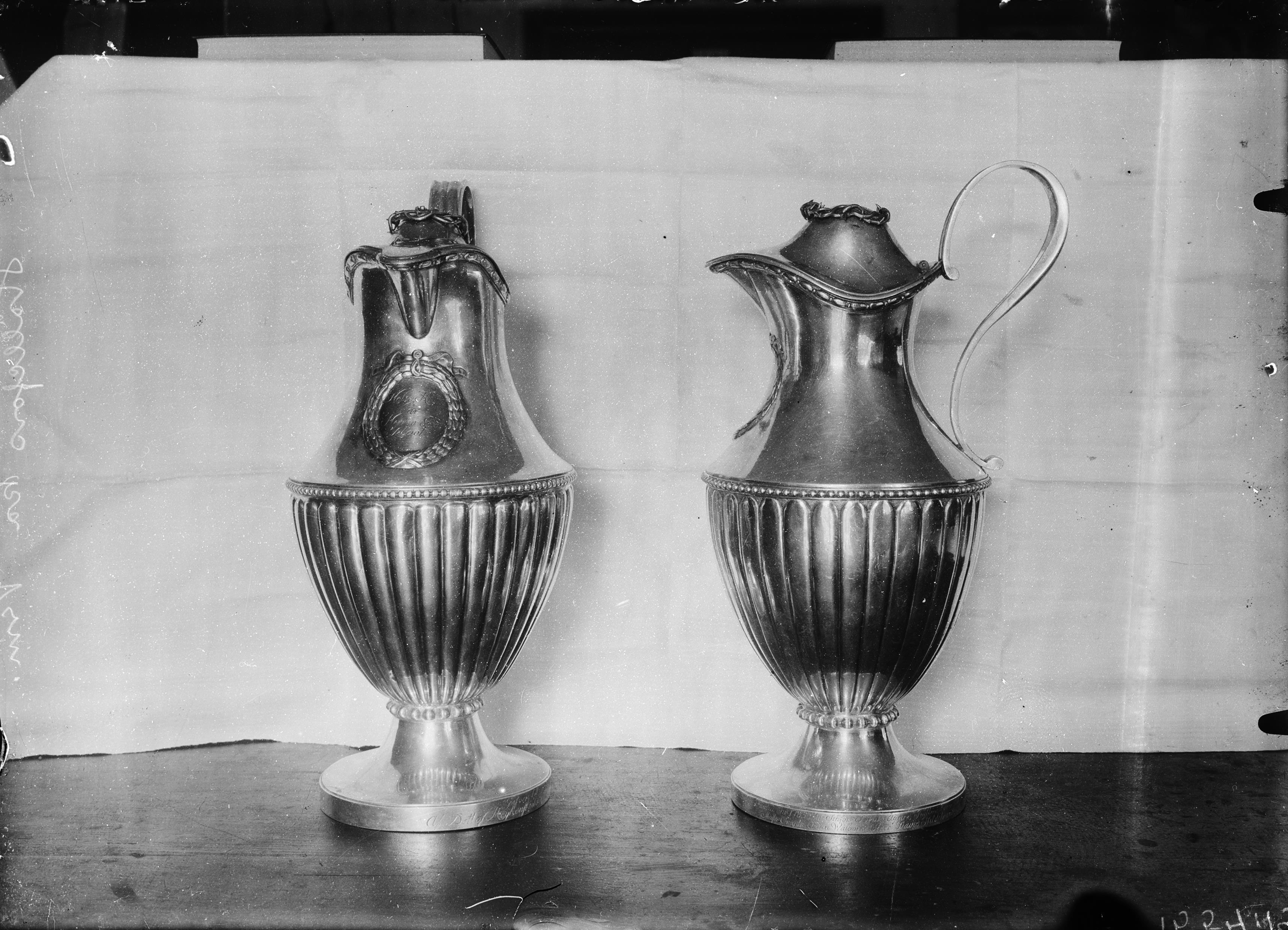 Vinkannor. 1 par, av silver. Gustaviansk form med lock krönta av förgylld törnekrans. Strax under pipen, pålödd oval platta omgiven av en krans med inskrift. Enligt inskrift på foten är båda skänkta 1783. Snabbinv.