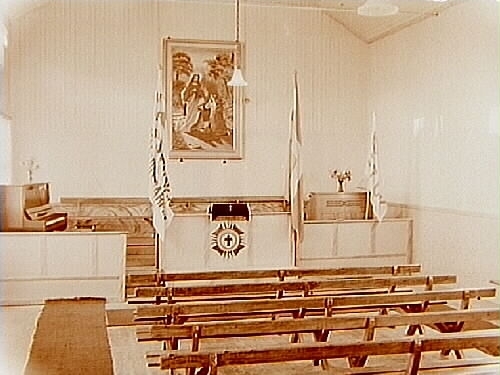 Svenska Frälsningsarmén, interiör, bänkar, orgel och en tavla med kristusgestalt m. m.
