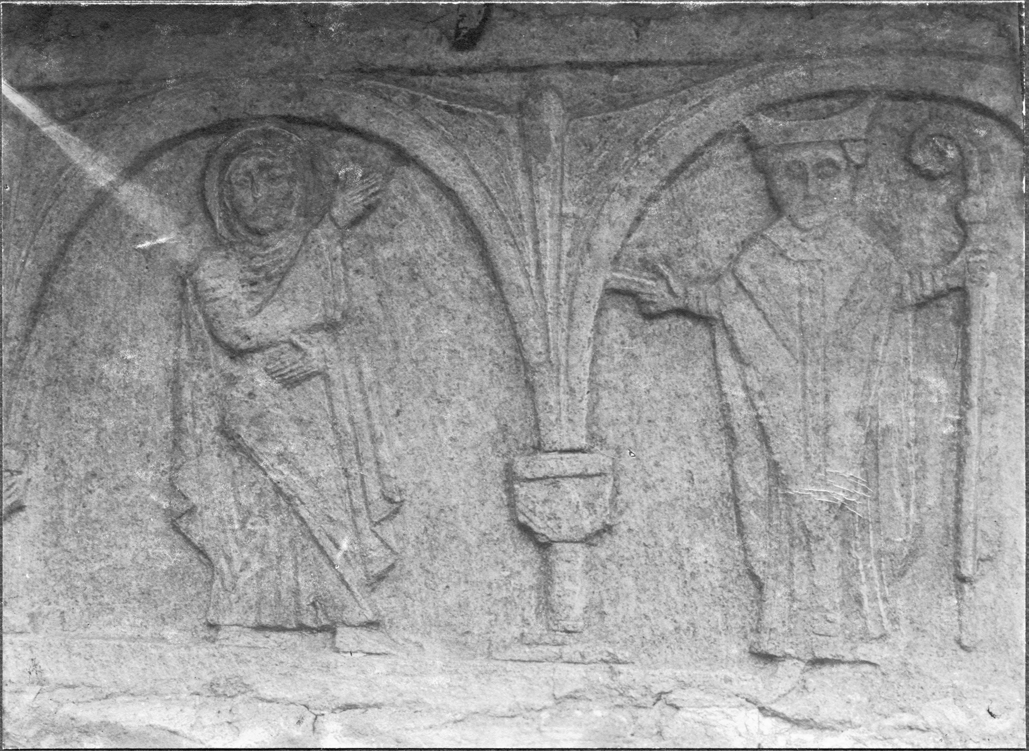 Byzantiosreliefer på korets sydfasad. Kvinna med gloria och välsignande biskop.