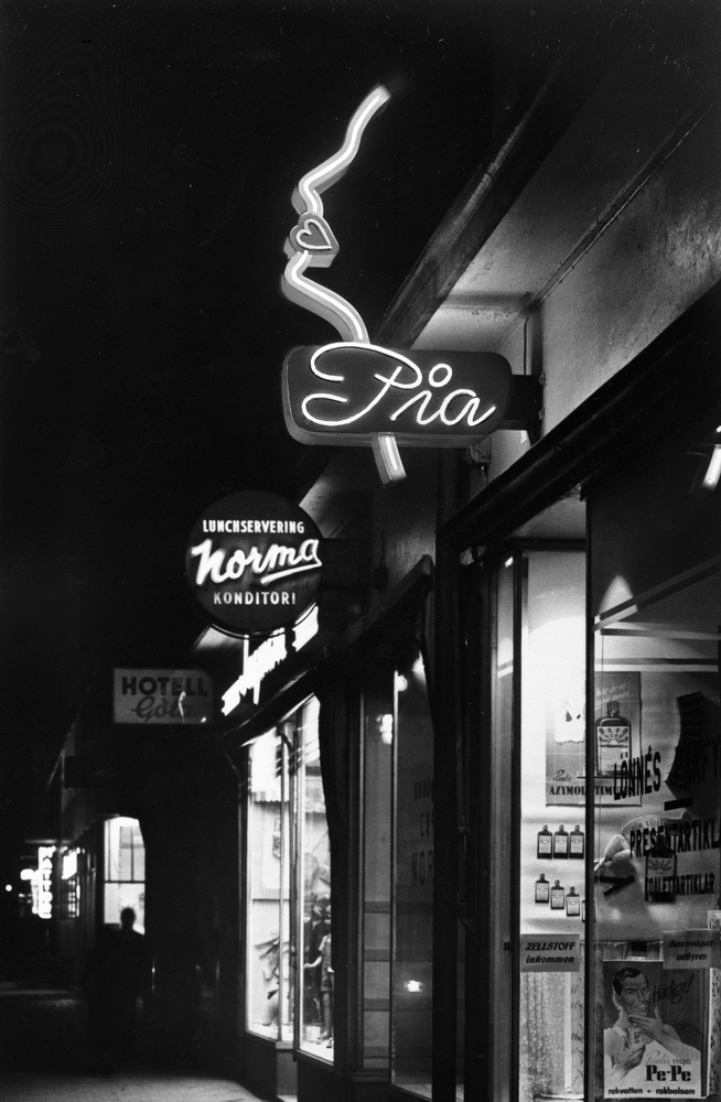 Pia hygienartiklar, affärsbyggnad, neonskylt från Roos Neon.
