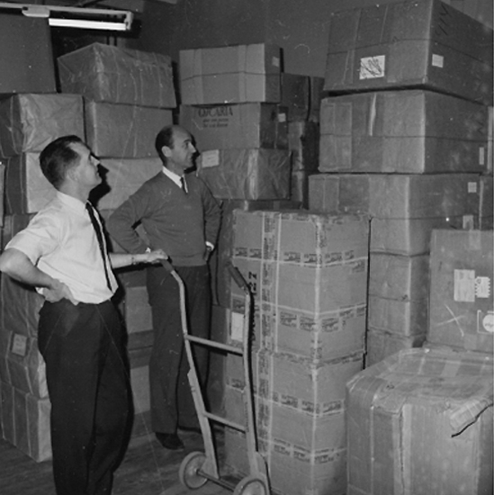 Oscaria Skofabrik, interiör av lagret, två män.