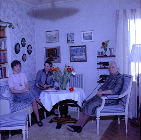 Rumsinteriör, familjegrupp tre personer, födelsedag.