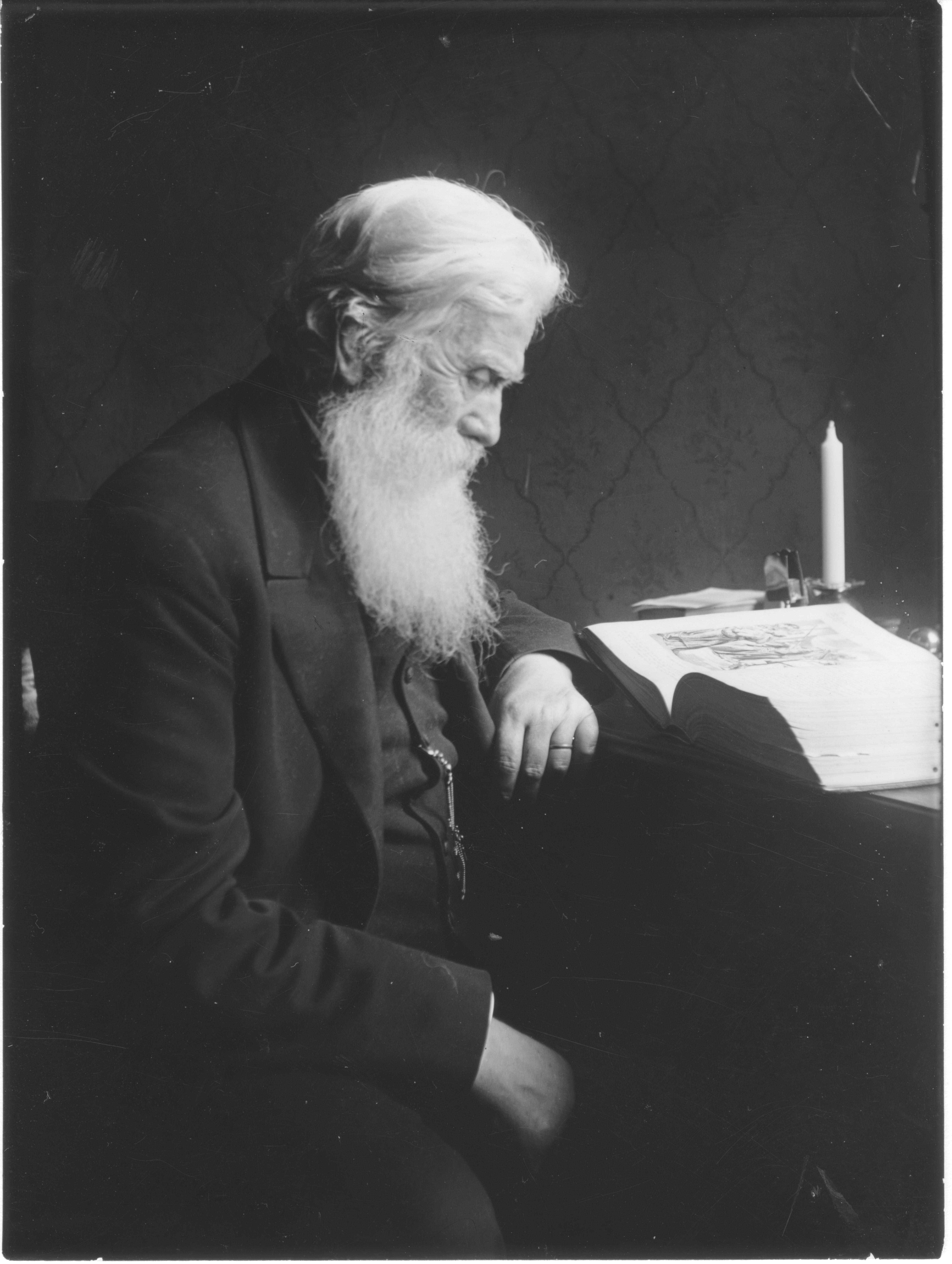 Man som läser i en bok vid ett stearinljus.