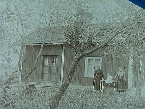 Envånings stuga, två kvinnor och en liten flicka framför stugan.