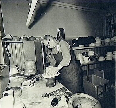 Lindbergs Strå- och Filth. Hattillverkning. 203/67 Hatten torkas och formas därefter på träform. Här först kullen därefter brättet.