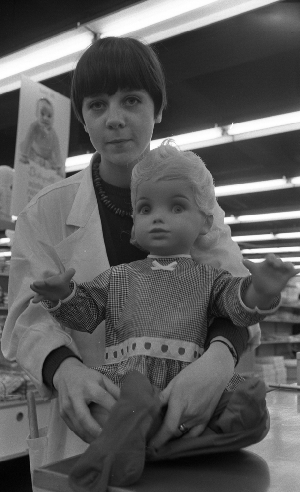 Ett butiksbiträde klär på en babyskyltdocka. Biträdet är klädd i vit arbetsrock.