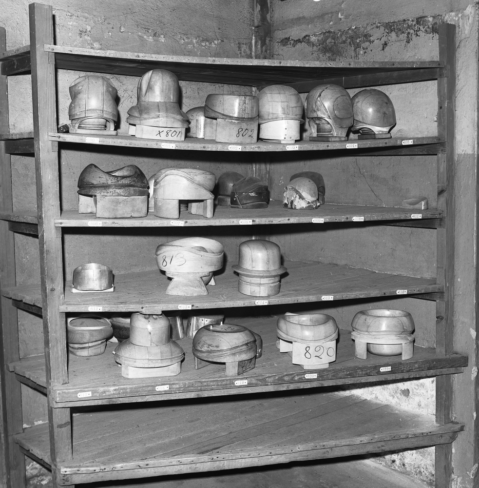 Lindbergs Strå- och Filth. Hattillverkning. 217/67 Träformar i hörnhylla i formrummet
