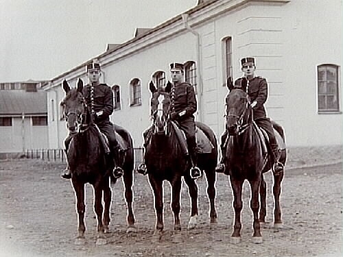 Kungliga Svea Trängkår, 3 soldater till häst vid stallet.