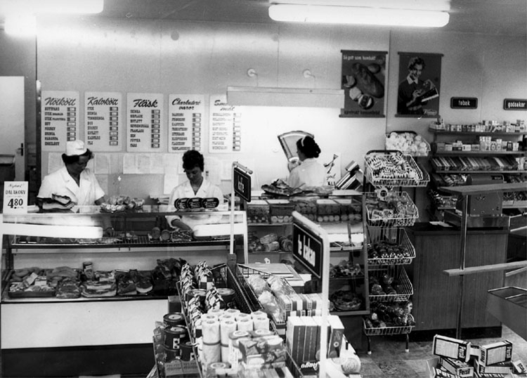 Konsum, affärsinteriör, charkuteriavdelningen, tre personer.