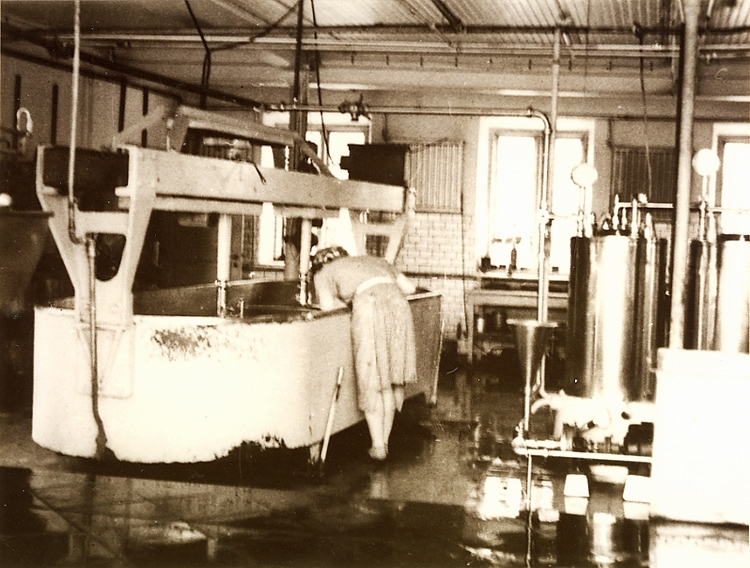 "På bilden syns ett ostkar som Arefors konstruerade år 1934. karet är självgående och kunde fällas så att vasslen rann av."