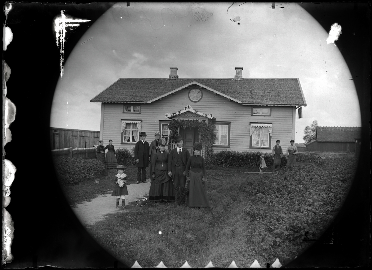 Familj samlad framför bostadshus