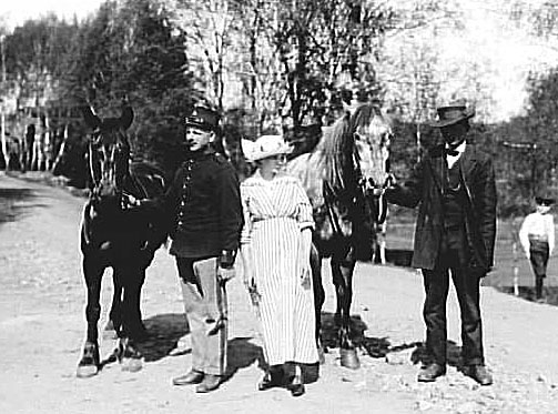 Bilden med de tre personerna och två hästar är Fritz Svensson (till vänster), den unga damen är hans syster Lisa Svensson och mannen till höger är brodern Olof Svensson. Bilden är tagen på landsvägen utanför deras hem.