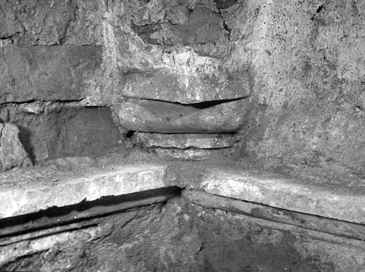 Soopska gravkoret under kyrkans södra utbyggnad. Sydöstra nedre delen av koret med listverk samt konsol för valv. Listverket och konsolen huggna i kalksten. Valvanfangen ovan konsolen synlig å bilden.