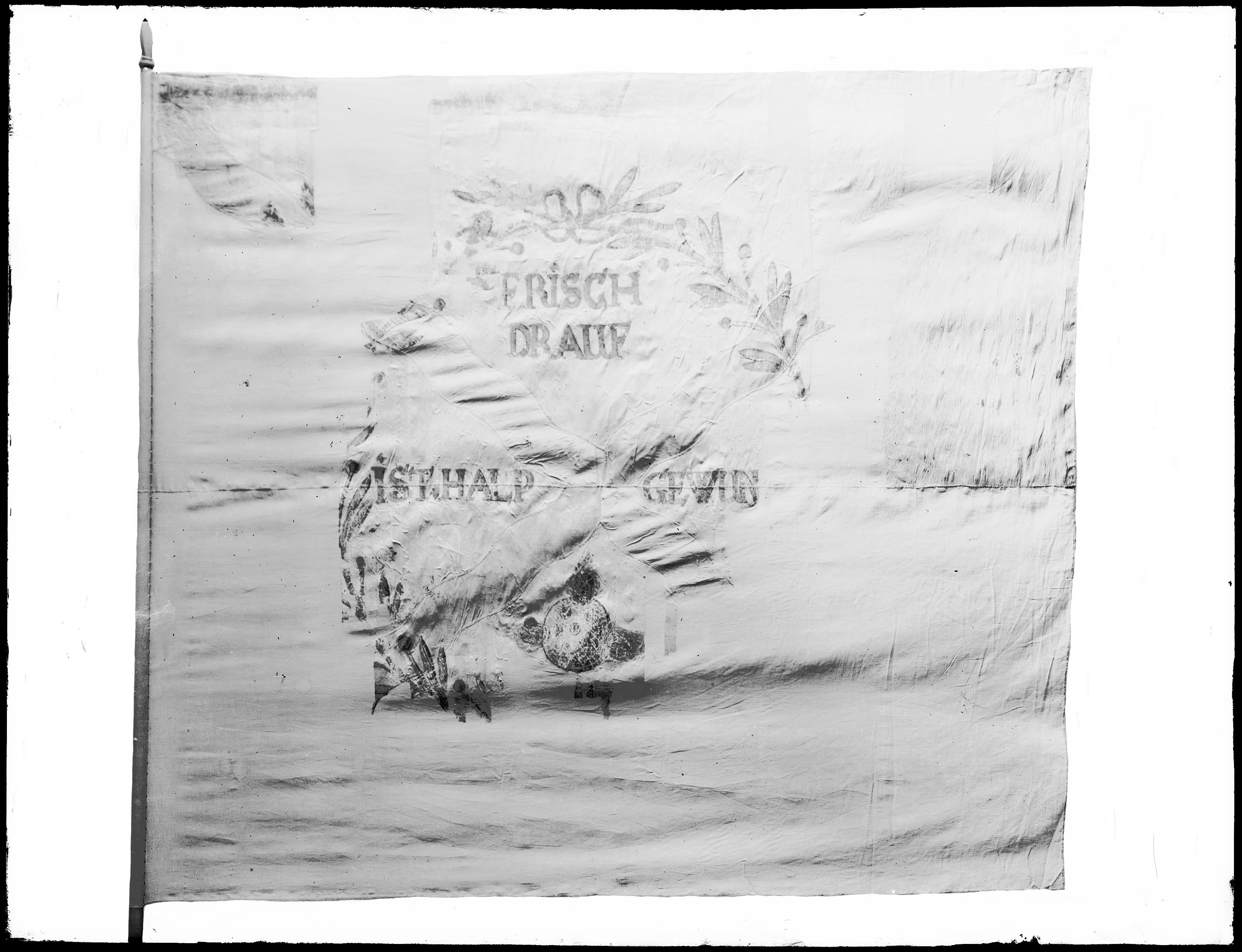 Fana av vitt siden med två gula diagonalband med texten "Frisch drauf ist halb gewunen", troligen tillhörig kapten Erik Furugrens kompani.