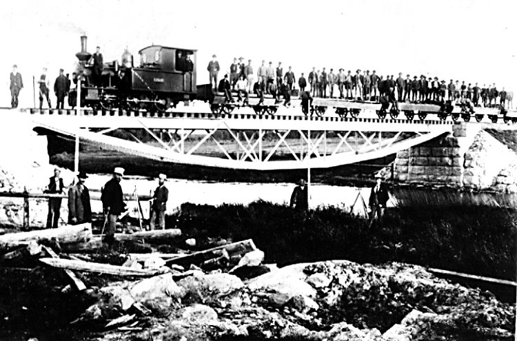 "Fotot visar hur man vid banbygget år 1899 "provtrycker" bron över Flian vid Kålltorp.