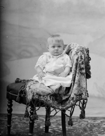 Titel: Ateljé. Litet barn i stol. Fotograf: Ellen Kock? Axel Lundbäck m.fl. Gullspångssamlingen. Bilder från Gullspång med omnejd.