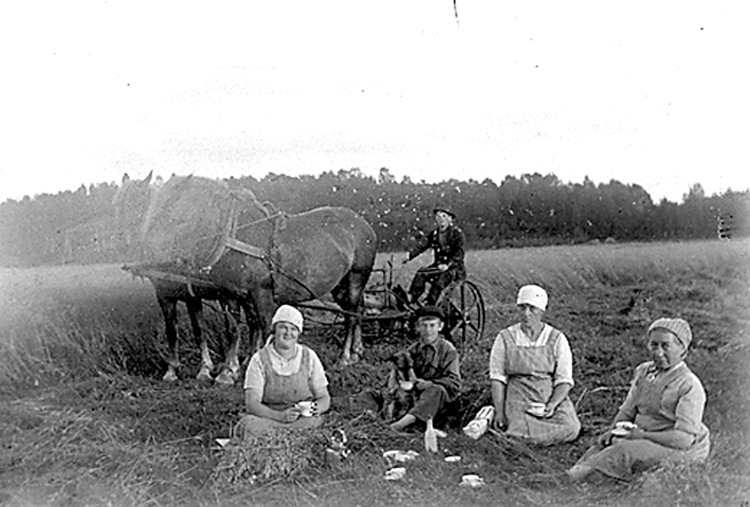 Från Milsmaden, Gunnar Andersson sitter på självbindaren, det är kafferast tillsammans med medhjälparna Karin, hennes lillebror Erik Jansson samt Berta och Ellen Andersson.