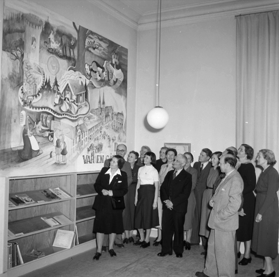 Tor Hellström avtäcker sitt konstverk "Det var en gång" på bibliotekets barnavdelning 1951.